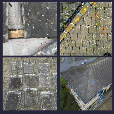 • Annotated drone photographs showing the damaged tiles and moss coverage